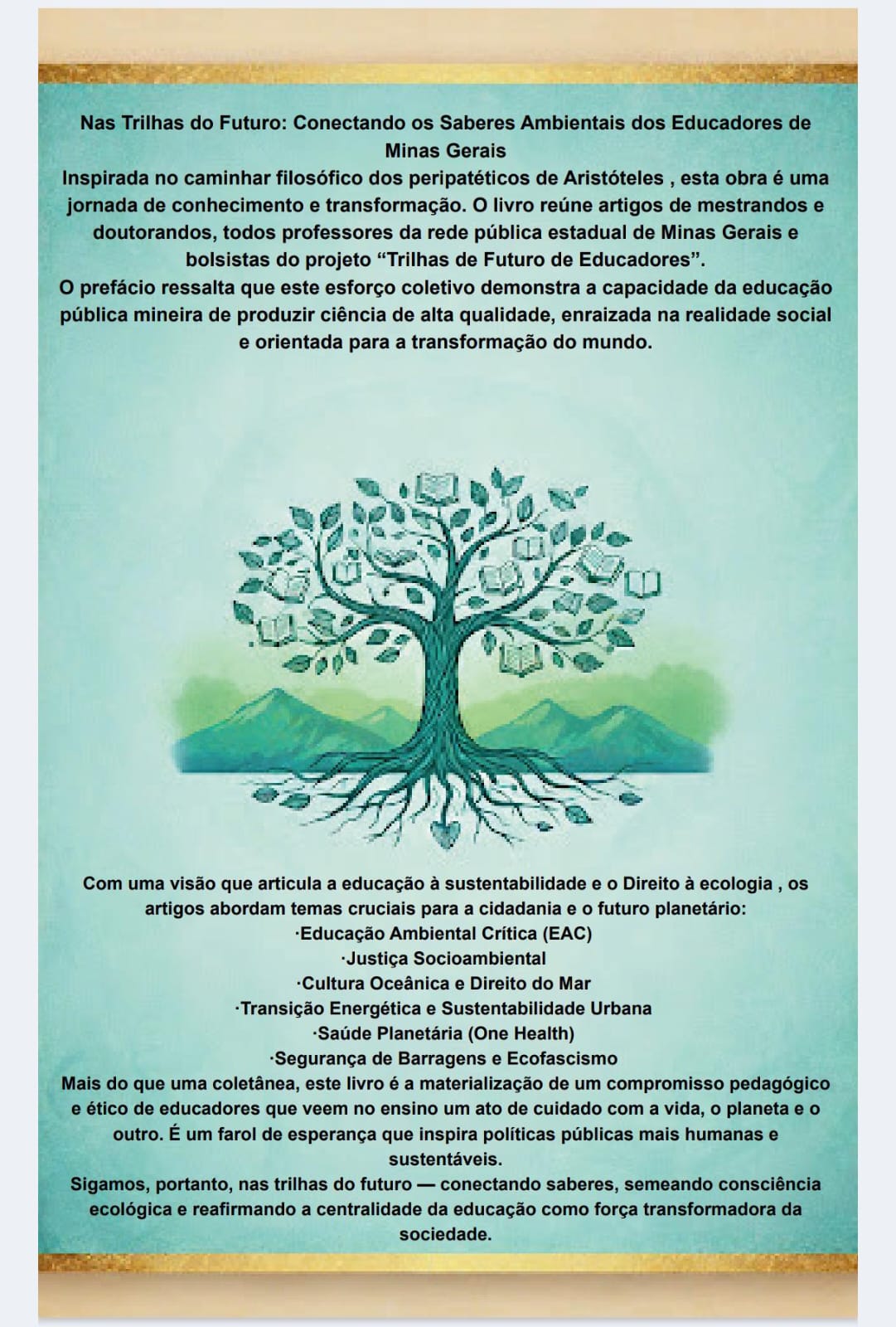 A obra reúne 34 autores, responsáveis por 19 capítulos, todos construídos por docentes participantes do Trilhas de Futuro Educadores. Resultado de um percurso formativo marcado pelo esforço e pela pesquisa, o livro apresenta estudos sobre educação ambiental crítica, cidadania, sustentabilidade, saúde planetária, justiça socioambiental e transição energética, conectando a produção acadêmica ao cotidiano das escolas mineiras.